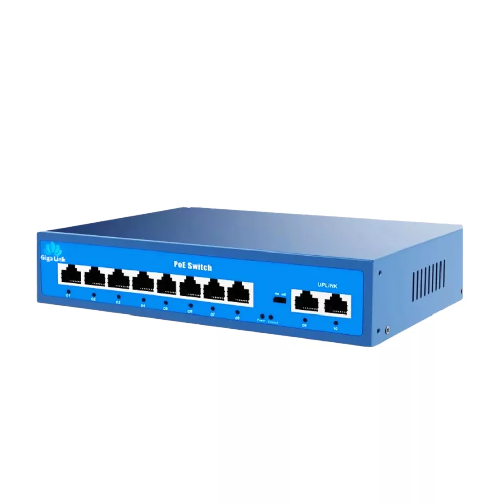 Gigalink RR-GB82A is a robust 8-port PoE switch designed for high-performance networking. This device meets IEEE 802.3af/at standards and provides up to 30W per port. It efficiently powers devices like IP cameras and access points. Moreover, its Power over Ethernet (PoE) function works up to 250 meters. This allows for flexible setup without losing connectivity.